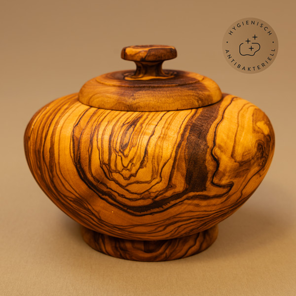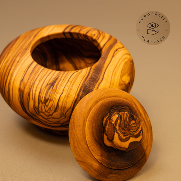 Die Dose wird in sorgfältiger Einzelfertigung aus massivem Olivenholz gedrechselt. Ihre bauchige Form liegt angenehm in der Hand und wirkt gleichzeitig elegant. Jede Dose ist ein handwerkliches Unikat mit viel Liebe zum Detail.