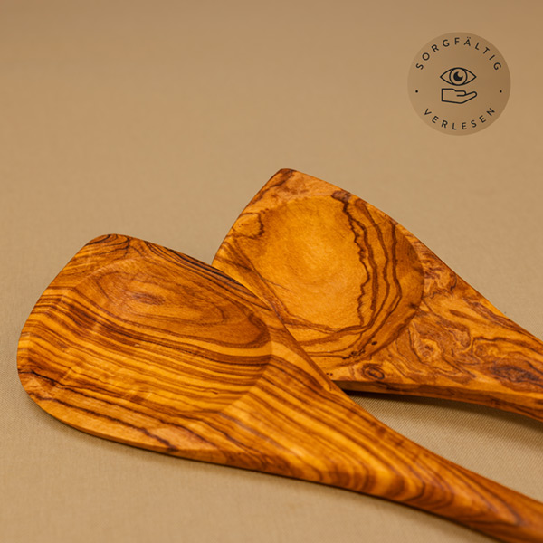 Olivenholz ist hygienisch, antibakteriell und nimmt kaum Gerüche oder Feuchtigkeit auf. Durch die hohe Dichte liegt der Pfannenwender angenehm in der Hand und ist besonders stabil. Die individuelle Maserung macht jedes Stück einzigartig.