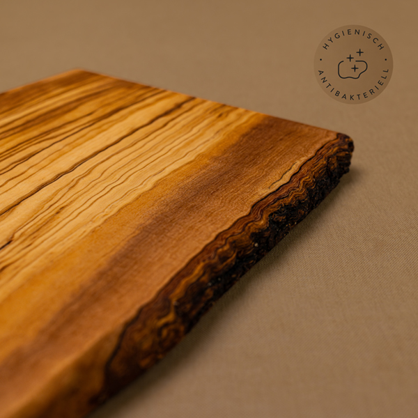 Das ölhaltige Olivenholz ist von Natur aus antibakteriell, was das Frühstücksbrett mit naturbelassener Seite zur sicheren Unterlage für dein Frühstück macht. Zudem lässt sich Olivenholz ganz einfach per Hand säubern und auch die Naturkante kann mit etwas Wasser und einem sanften Spülmittel gereinigt werden. Unser Tipp: Regelmäßig mit Speiseöl behandeln, so strahlt das Holz noch länger.