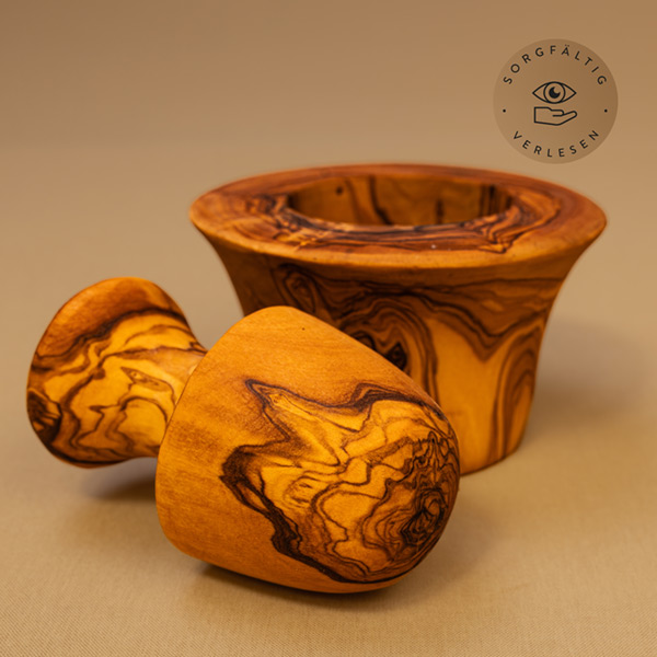 Seit knapp 20 Jahren sind wir der Herstellung hochwertiger Olivenholzprodukte verpflichtet und fertigen jeden Mörser von Hand in unserer Manufaktur am Alpenrand. Mit Hingabe und Sorgfalt entstehen Mörser und Stößel aus Olivenholz, die ihresgleichen suchen und dich - gute Pflege vorausgesetzt - ein Leben lang in der Küche begleiten.