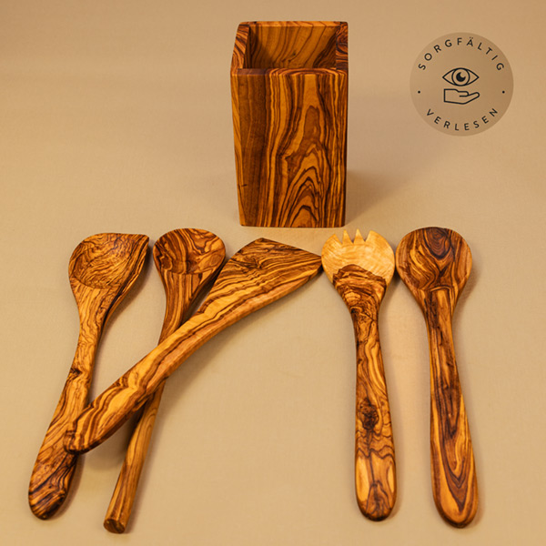 Kochlöffelhalter und Küchenhelfer bestehen aus 100 % massivem tunesischen Olivenholz, einem der widerstandsfähigsten Hölzer überhaupt. Von Natur aus antibakteriell, robust und frei von künstlichen Beschichtungen ist Olivenholz eine nachhaltige und langlebige Wahl für deine Küche.