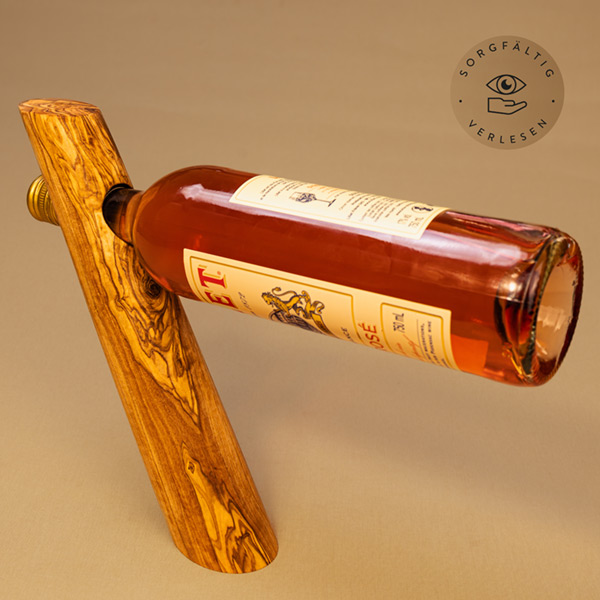 Jeder Flaschenhalter wird in sorgfältiger Handarbeit aus einem massiven Stück Olivenholz gefertigt. Durch präzise Ausarbeitung entsteht eine stabile Form, die eine Weinflasche scheinbar schwebend präsentiert. Ein kleines Kunstwerk, das echtes Handwerk spürbar macht.