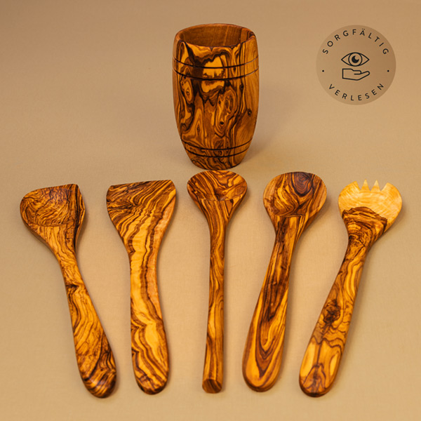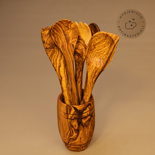 Mit fünf essenziellen Küchenhelfern aus Olivenholz enthält dieses Set die Grundausstattung, die in keiner Küche fehlen darf: