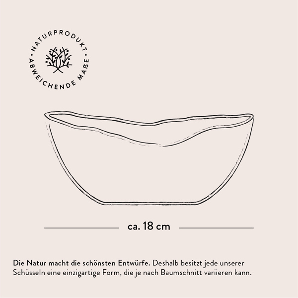Das geölte Olivenholz ist lebensmittelecht und schützt die Schale zuverlässig vor Flecken und Gerüchen. So eignet sich das Schälchen für trockene wie auch ölige und flüssige Speisen. Die Reinigung ist simpel: Ein feuchtes Tuch genügt. Um die natürliche Schönheit zu bewahren, empfehlen wir, die Oberfläche hin und wieder mit ein wenig Pflegeöl zu behandeln.