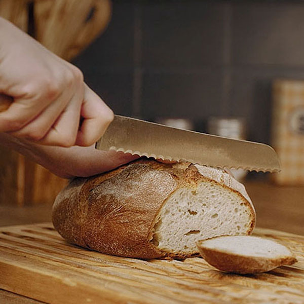 Schont Messer und fängt Krümel charmant auf. Entdecke unsere Brotschneidebretter aus Olivenholz!