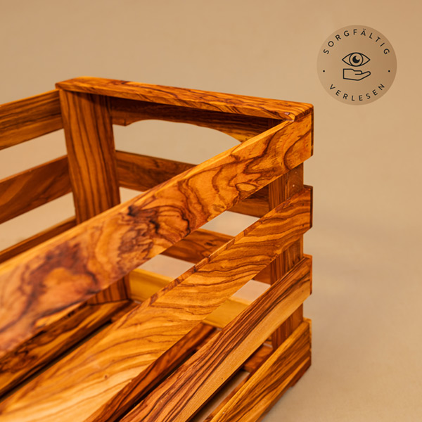 Diese Obstkiste ist frei von chemischen Beschichtungen und aus 100 % unbehandeltem Olivenholz gefertigt. Das macht sie ideal zur Aufbewahrung von Lebensmitteln wie Obst, Brot oder Kartoffeln – ganz ohne Plastik und künstliche Stoffe.