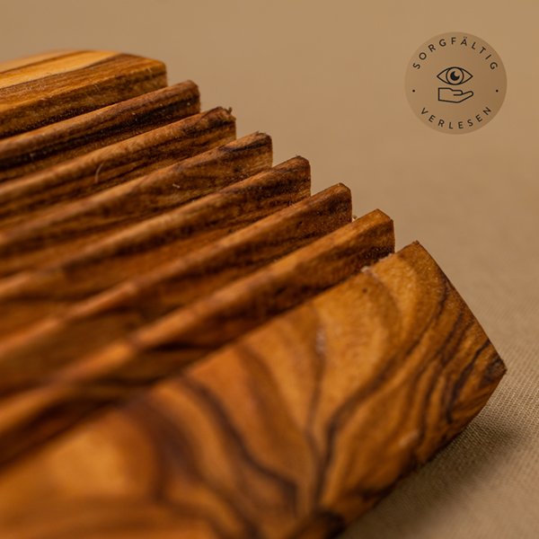 Gefertigt aus einem Stück massivem Olivenholz, unbehandelt und fein geschliffen. Die dichte Struktur des Holzes verhindert das Eindringen von Feuchtigkeit, während die natürlichen Öle auf der Oberfläche eine antibakterielle Wirkung entfalten. Ideal für die tägliche Nutzung im Bad oder in der Küche.