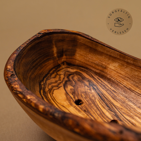 Gefertigt aus massivem Olivenholz, komplett unbehandelt und plastikfrei. Die Oberfläche ist fein geschliffen, geölt und bleibt dennoch offenporig genug, um Feuchtigkeit auf natürliche Weise zu regulieren. Eine langlebige Alternative zu Kunststoffschalen – ökologisch und ästhetisch.